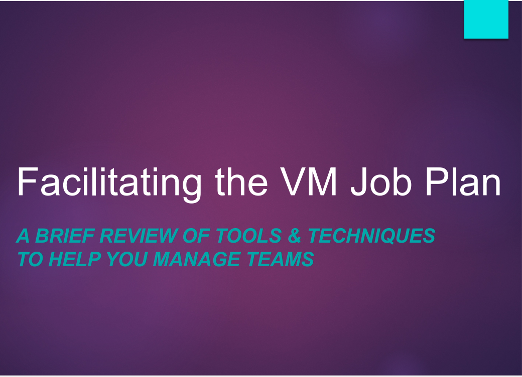 Facilitation is one of the critical skills necessary to effectively manage the VM process and, especially, a value study team. This Value Voices session will discuss the alignment between the International Association of Facilitators (IAF) Core Competencies, and the steps in the VM Job Plan. Emphasis will be placed on the importance of neutrality in one’s role as a Study facilitator. View the presentation in publications This Value Voice event may be considered acceptable by your accrediting...